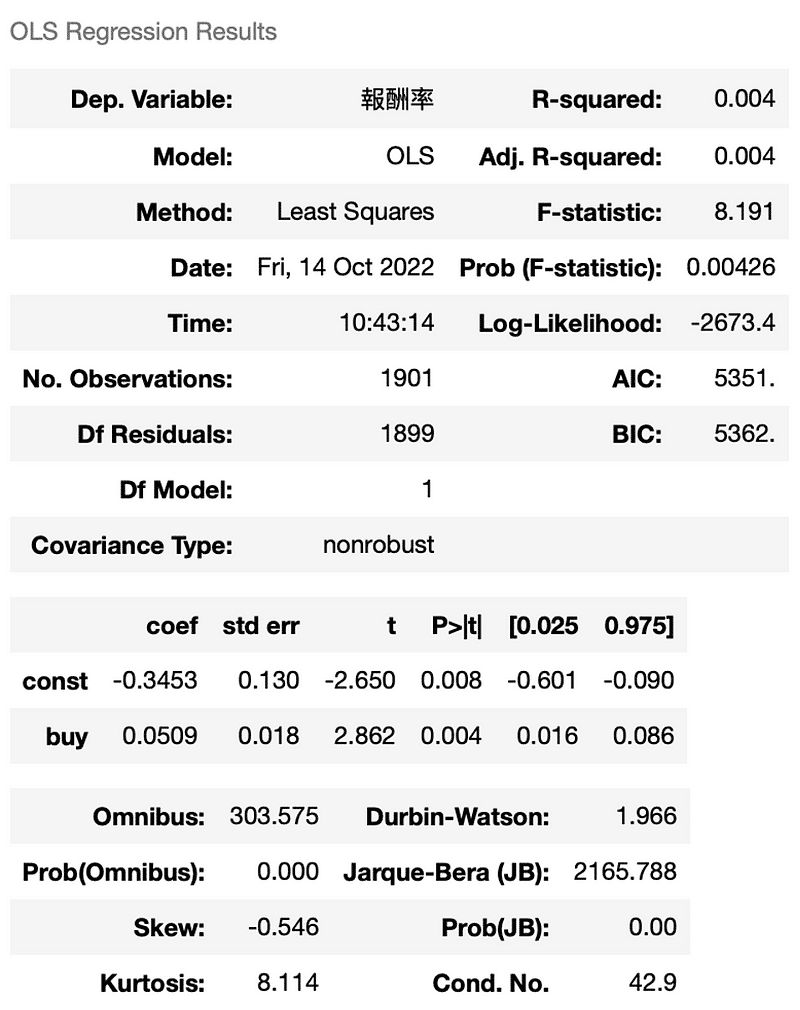 X = sm.add_constant(result['buy']) b = sm.OLS(result['報酬率'], X).fit() b.summary()