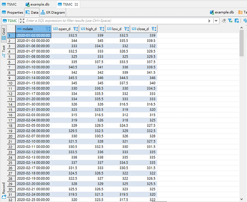 #讀取 sql_query = "SELECT * FROM TSMC" TSMC = pd.read_sql(sql_query, con=conn, coerce_float=False)