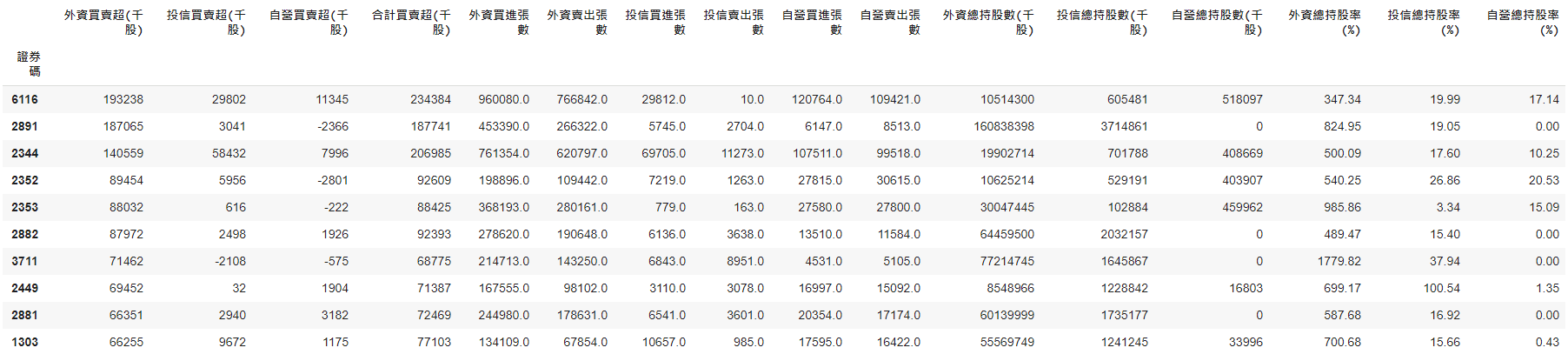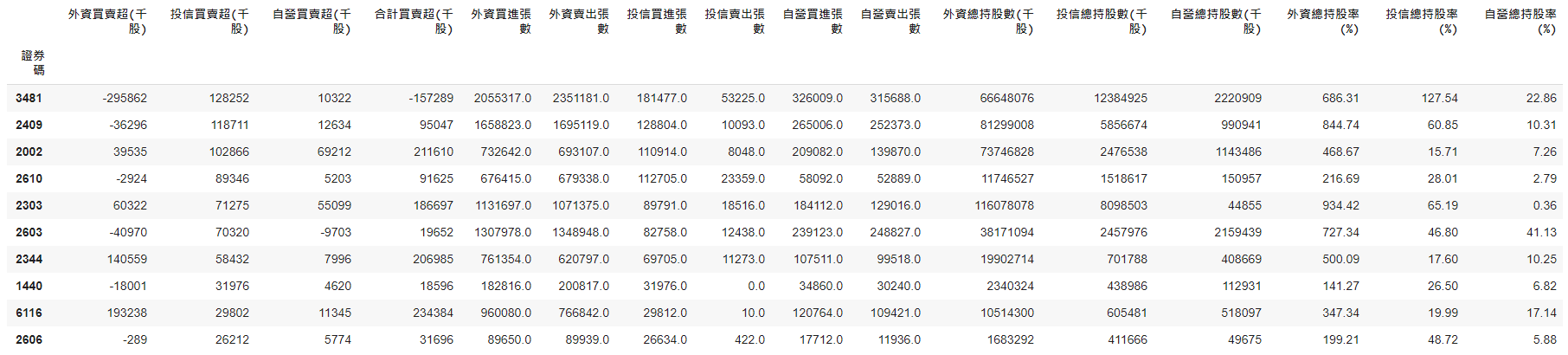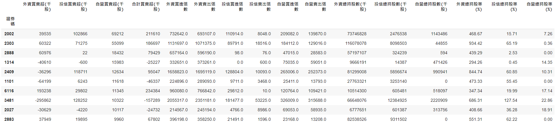 sorted_fi[(sorted_fi['外資買賣超(千股)']>0)&(sorted_fi['投信買賣超(千股)']>0)&(sorted_fi['自營買賣超(千股)']>0)][:10]