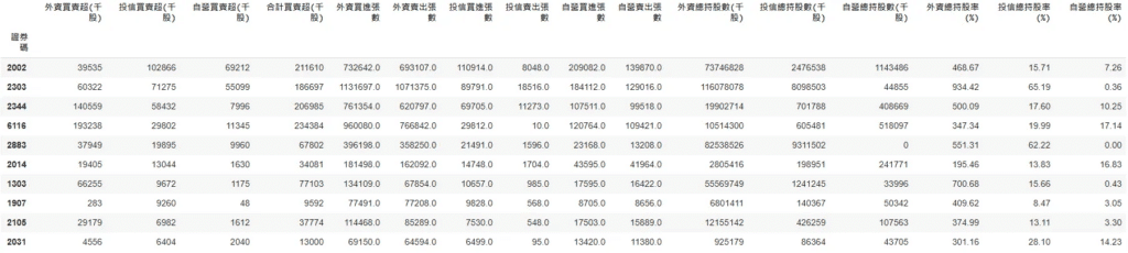 分別以外資、投信和自營買賣超為排序標準,計算一個月以來的累積買賣超,下圖以排序前10名為例。