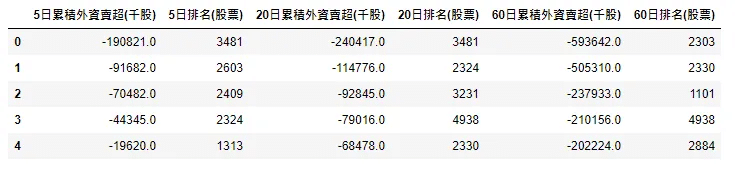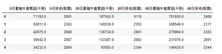 buy_table[str(i)+'日累積外資買超(千股)'] = x.loc[len(x)-1].sort_values(ascending=False)[:5].reset_index(drop=True)