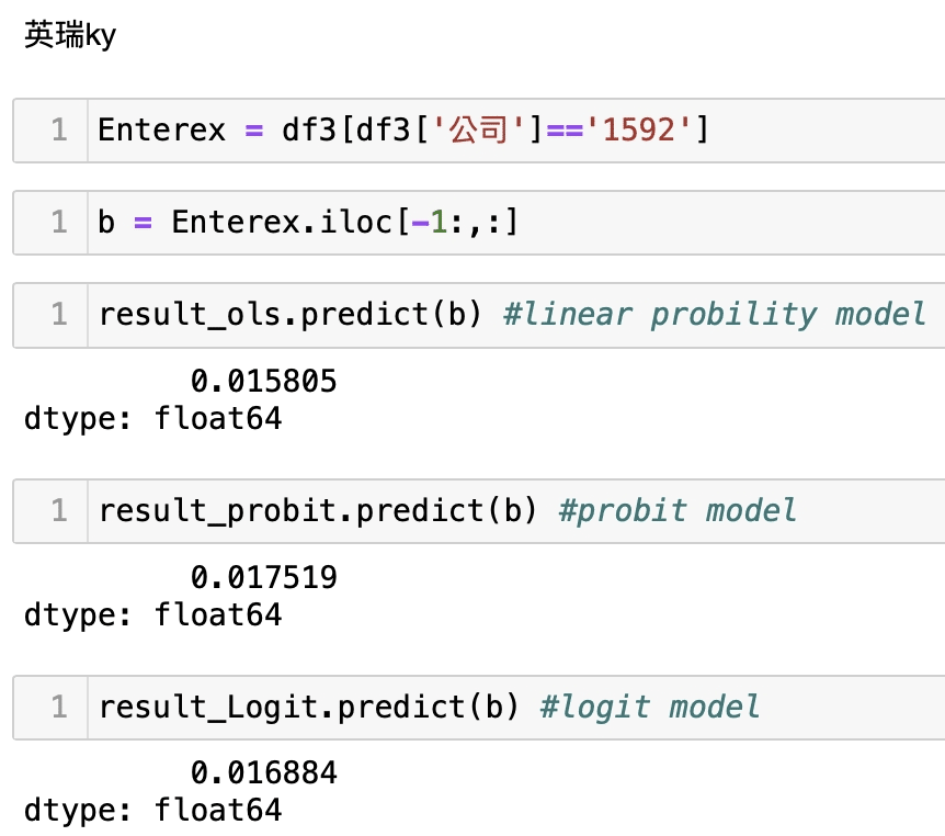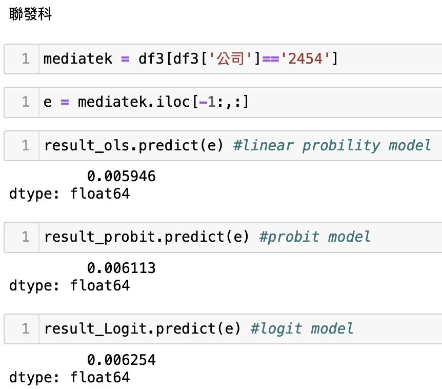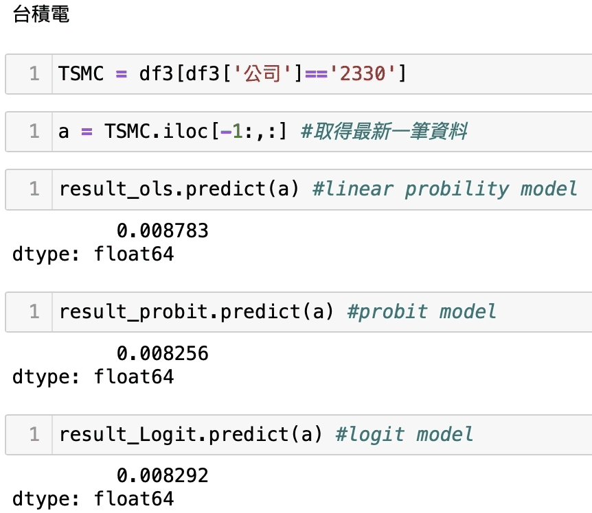 可以發現我們的護國神山及發哥的危機事件發生極為低,假設以他為基準來比較可以看到LPM模型(OLS),下市的1592英瑞KY、2475華映的危機發生機率比2330台積電、2454聯發科來得多出至少3倍以上,直觀而言,權值股之所以是權值股,他的公司體質一定比其他公司來的好,此預測不代表絕對,我們僅使用了相關會計資料所顯示的狀態去作出回歸驗證,但還是具有一定參考性及解釋力,這也意味著股市本來就存在不確定性,若有看似危機的訊號出現應當時刻關注,並留意自身風險的評估;因此,歡迎持續關注本平台,我們後續將會有更多文章向大家分享,此外,也歡迎讀者及投資者們選購 TEJ E Shop中的方案來套用試試看自身手中的持股,危機發生的可能與比較,相信讀者擁有完整的資料庫後,就能對股市的不確定性有所掌握。