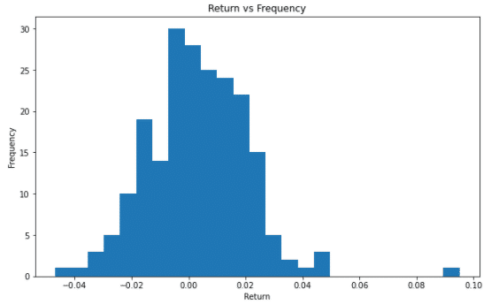 再來則是直方圖,我們可以用直方圖的方式去了解說像是整年度的對數報酬率出要分布在甚麼區間以及他們的出現頻率為何。那直方圖主要差異就是用plt.hist()的方式,並搭配bins去決定說每一個長條之間分隔點為多少(類似決定說寬度是多少)。