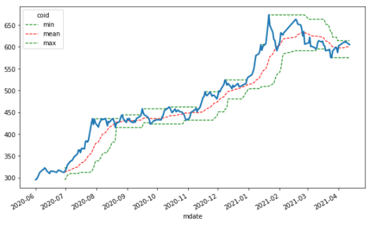 ##最高值/最低值/平均值 windows = 20 data['min'] = data['2330'].rolling(windows).min() data['mean'] = data['2330'].rolling(windows).mean() data['max'] = data['2330'].rolling(windows).max()
