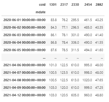 data = df.pivot_table(index = df.index, columns = 'coid', values = 'close_d')