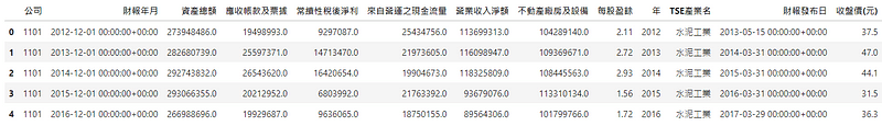 # 資料前處理code = code.rename({'證券碼': '公司'}, axis=1) # 改名字data = data.rename({'公司代碼':'公司'}, axis=1) # 改名字data_annouce = data_annouce.rename({'年/月':'財報年月'}, axis=1) # 改名字data_price = data_price.rename({'證券代碼':'公司'}, axis=1) # 改名字data_price['年'] = data_price['年月日'].dt.year - 1 # 改成財報年data_price = data_price[data_price['年月日'].dt.month == 3]data_price = data_price.drop_duplicates(subset=['公司','年'], keep='last') # 只保留三月底收盤價data['年'] = data['財報年月'].dt.yeardata = data.drop_duplicates(subset=['公司','年'], keep='last') # 只保留年底資料