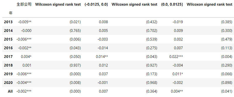 def cal_wilcoxon(group):return pd.DataFrame({'DCA': group.median(),'p-value': wilcoxon(group)[1]}, index = [0])def add_star(df,p_value):'''p-values of the Wilcoxon signed rank test <= 0.01,則係數新增***0.01 < p-values of the Wilcoxon signed rank test <= 0.05,則係數新增**0.1 < p-values of the Wilcoxon signed rank test <= 0.01,則係數新增*'''df = np.select([(p_value <= 0.01),(p_value > 0.01) & (p_value <= 0.05),(p_value > 0.05) & (p_value <= 0.1)],[df.apply(lambda x: '%.3f'%x + '***'),df.apply(lambda x: '%.3f'%x + '**'),df.apply(lambda x: '%.3f'%x + '*')],default = df.apply(lambda x: '%.3f'%x))return dfdef run_data_cal_wilcoxon(df):'''p-values of the Wilcoxon signed rank test for one sample median DCA equal to 0'''finaldf = pd.DataFrame()for data in df:temp = data.dropna(subset=['DCA']).groupby('年')['DCA'].apply(cal_wilcoxon).reset_index(level=1, drop=True)temp.loc['All','DCA'] = data.dropna(subset=['DCA'])['DCA'].median()temp.loc['All','p-value'] = wilcoxon(data.dropna(subset=['DCA'])['DCA'])[1]temp['DCA'] = add_star(temp['DCA'],temp['p-value'])temp['p-value'] = temp['p-value'].apply(lambda x: '(' + '%.3f'%x + ')')finaldf = pd.concat([finaldf, temp], axis=1)return finaldfTable = run_data_cal_wilcoxon([data,data[data['益本比分組'].astype(str).isin(['(-0.025, 0.0]'])],data[data['益本比分組'].astype(str).isin(['(0.0, 0.025]'])]])