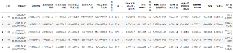 # 計算 DCAdata['Total accrual'] = (data['常續性稅後淨利'] - data['來自營運之現金流量']) * data['DCA 前期資產總額倒數'] # Ydata['DCA 前期資產總額倒數'] = 1 / data.groupby('公司')['資產總額'].shift(1) # X0data['DCA 營業收入差'] = data.groupby('公司')['營業收入淨額'].diff() * data['DCA 前期資產總額倒數'] # X1data['DCA 不動產廠房及設備'] = data['不動產廠房及設備'] * data['DCA 前期資產總額倒數'] # X2data['DCA 營業收入差 - 應收差'] = (data.groupby('公司')['營業收入淨額'].diff() -data.groupby('公司')['應收帳款及票據'].diff()) * data['DCA 前期資產總額倒數'] # X1