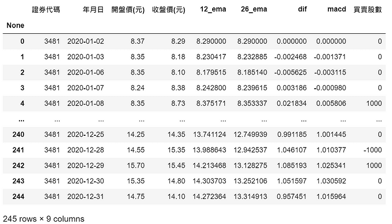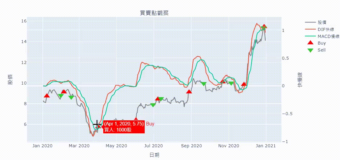 有了慢線與快線之後,即可建立買賣股數訊號。當兩日前的DIF仍小於MACD線stock_data[‘dif’].shift(2)<stock_data[‘macd’].shift(2),但卻於昨日DIF大於MACD stock_data[‘dif’].shift(1)>stock_data[‘macd’].shift(1),代表昨日出現黃金交叉買點,而因為這個訊號於昨日收盤才能確定,因此於今日開盤才購買1000股,若不符合買點條件,則維持原欄位內容stock_data[‘買賣股數’]。同理,出現死亡交叉時,亦是隔日開盤時才賣出1000股。