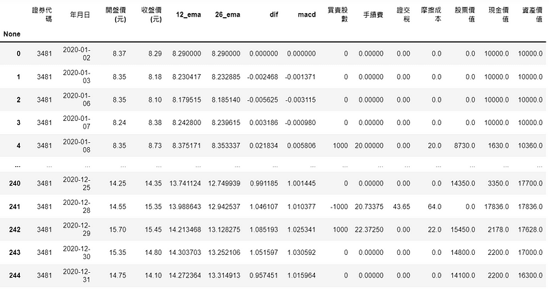 #如果死亡交叉,隔天開盤賣出 stock_data['買賣股數'] = np.where((stock_data['dif'].shift(1)<stock_data['macd'].shift(1)) & (stock_data['dif'].shift(2)>stock_data['macd'].shift(2)), -1000, stock_data['買賣股數'])
