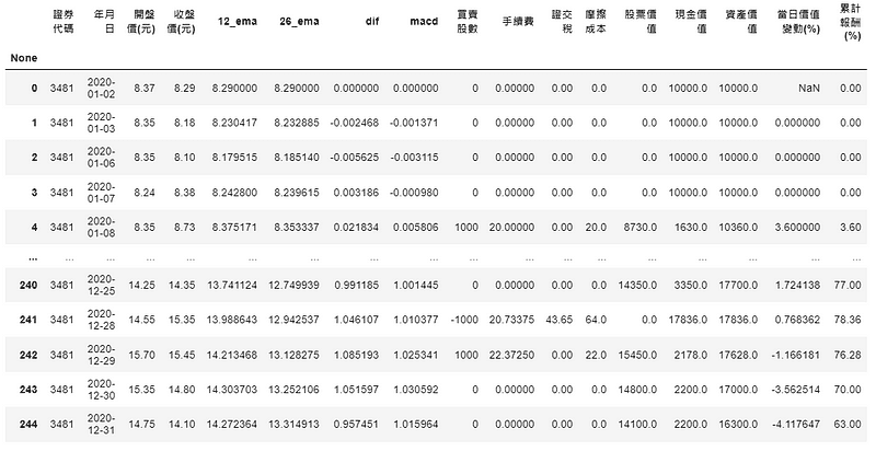 stock_data['當日價值變動(%)'] = (stock_data['資產價值']/stock_data['資產價值'].shift(1) - 1)*100 stock_data['累計報酬(%)'] = (stock_data['資產價值']/10000 - 1)*100
