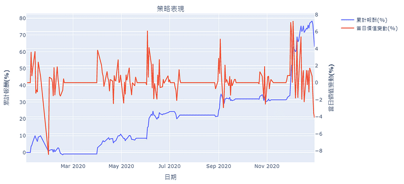 可以看到採用MACD策略,資產價值每日的波動在8%上下以內,若波動為0代表目前手中僅有現金部位。最後的累計報酬約為63%,優於同時期0050約30%左右報酬。