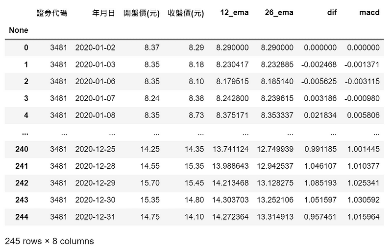stock_data['12_ema'] = stock_data['收盤價(元)'].ewm(span = 12).mean() stock_data['26_ema'] = stock_data['收盤價(元)'].ewm(span = 26).mean() stock_data['dif'] = stock_data['12_ema'] - stock_data['26_ema'] stock_data['macd'] = stock_data['dif'].ewm(span = 9).mean()
