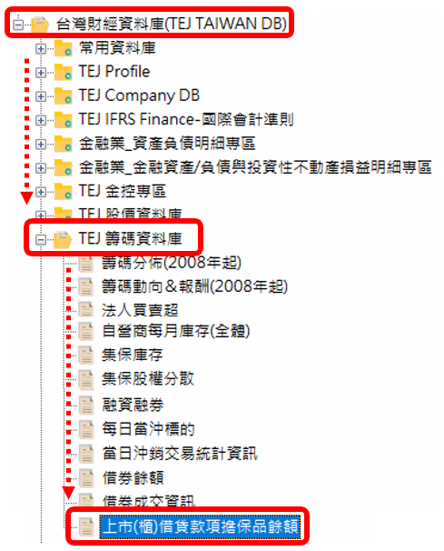1️⃣ 點選台灣財經資料庫➡️ TEJ 籌碼資料庫 ➡️ 上市(櫃)借貸款項擔保品餘額
