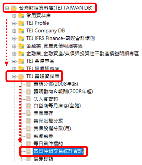 1️⃣ 點選台灣財經資料庫➡️ TEJ 籌碼資料庫 ➡️ 當日沖銷交易統計資訊