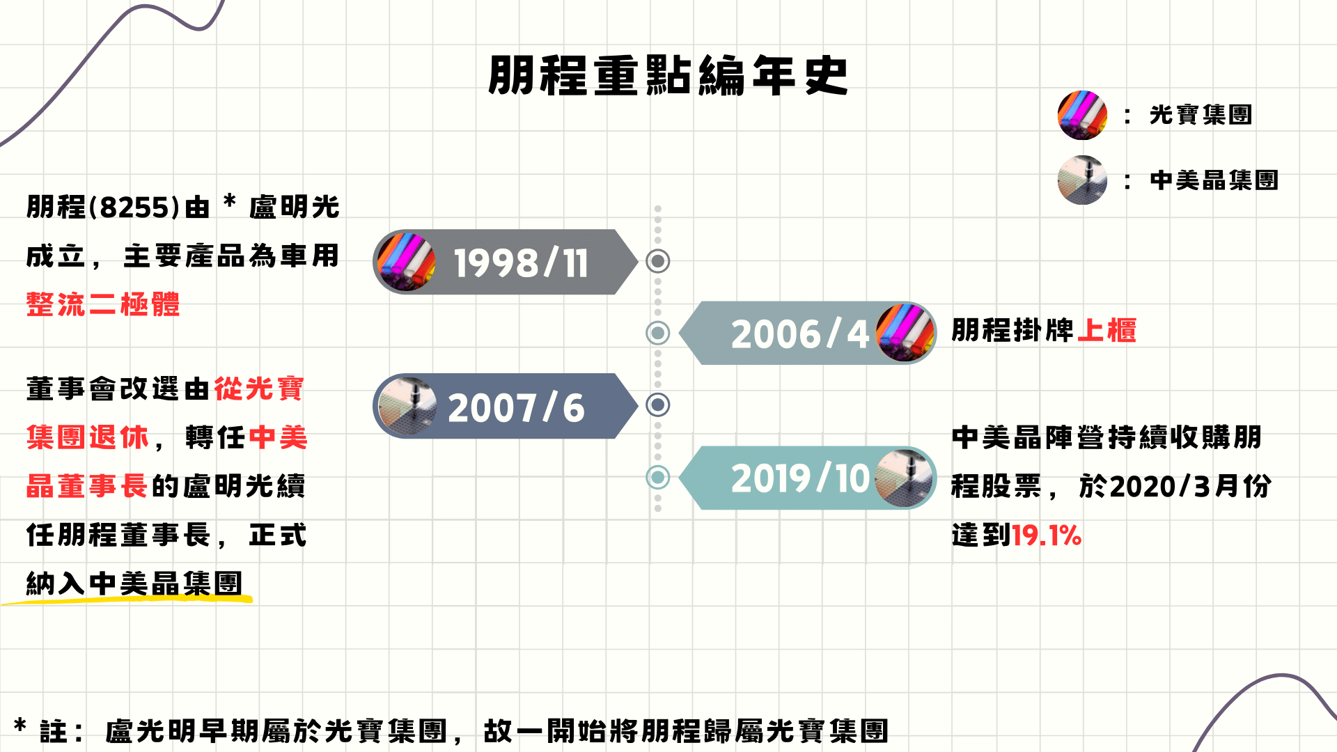 朋程科技(8255)於1998年11月由盧明光創立,初期獲中美晶和光寶集團入股為大股東,主要產品為車用整流二極體。2000年4月,盧明光辭去董事長,由宋恭源接任。