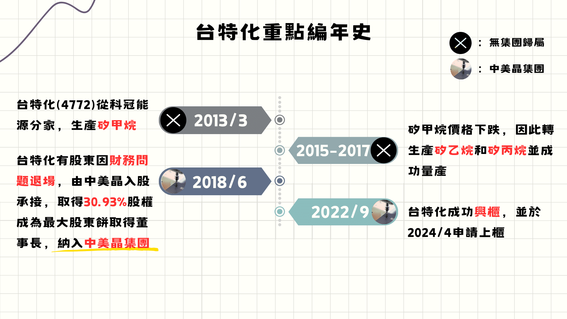 台特化於2022年3月公開發行,9月興櫃。2022年8月,台特化共有7席董事,其中3席獨立董事,中美晶集團持有31.62%的股權及3席董事(含1席董事長)。TEJ將2018年6月為台特化歸入中美晶集團的時點
