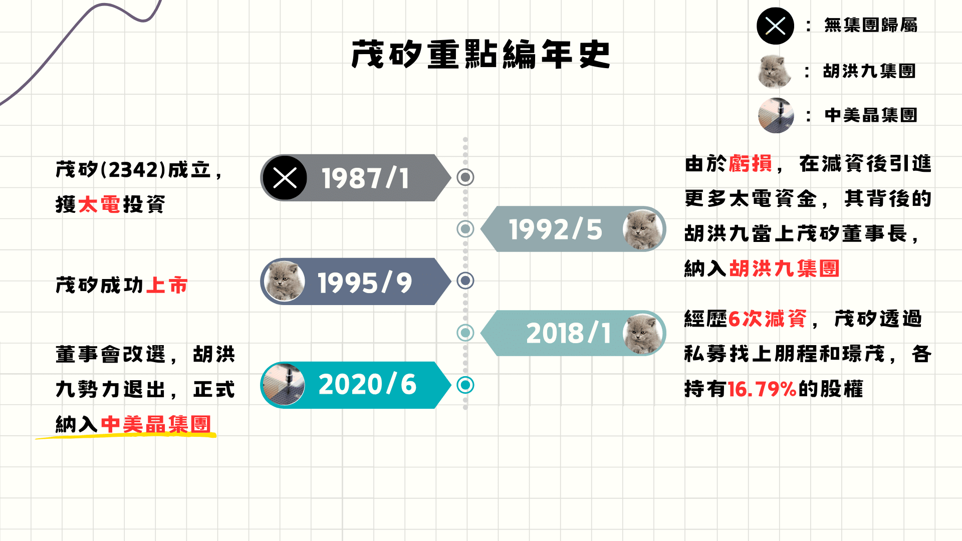 2020年6月董事改選,胡洪九勢力退出董事會,朋程科技取得1席董事。2021年4月,茂矽共有9名董事(含3名獨立董事),中美晶集團取得2席董事,持有17.88%股權。TEJ將2020年6月作為茂矽歸入中美晶集團的時點