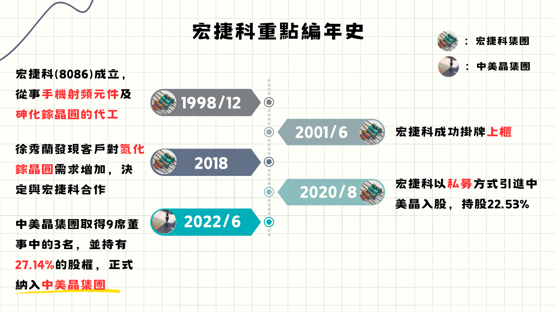 2020年8月,宏捷科技以私募方式引進中美晶入股,持股22.53%。2020年12月,徐秀蘭以中美晶法人董事代表進入董事會。2022年6月,宏捷科技董事會共有9名董事(含3名獨立董事),其中3名來自中美晶集團,該集團持有27.14%的股權。祁幼明仍留任董事長,但因中美晶集團席次已過半,TEJ將2022年6月視為宏捷科技歸入中美晶集團的時點