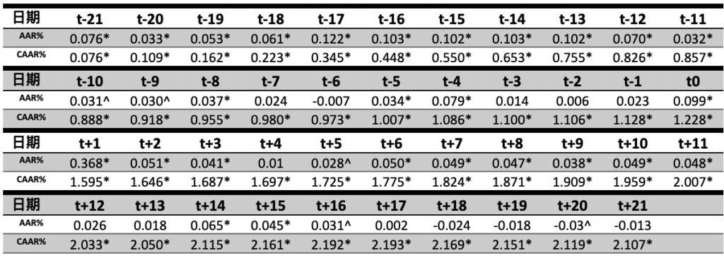 而在股利宣告後的次一交易日(t+1)中可看出,市場普遍對股票有正向的反應,AAR為0.368%,CAAR來到1.595%,也均達到5%內顯著水平。此外直至t+17日前仍持續有正向的AAR,CAAR最高來到2.193%,後續AAR才逐漸轉負,顯示市場約花3週時間吸收並反應該事件消息。