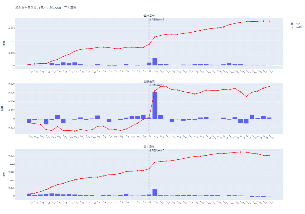 title="股利宣告日前後21天AAR與CAAR-三大產業",