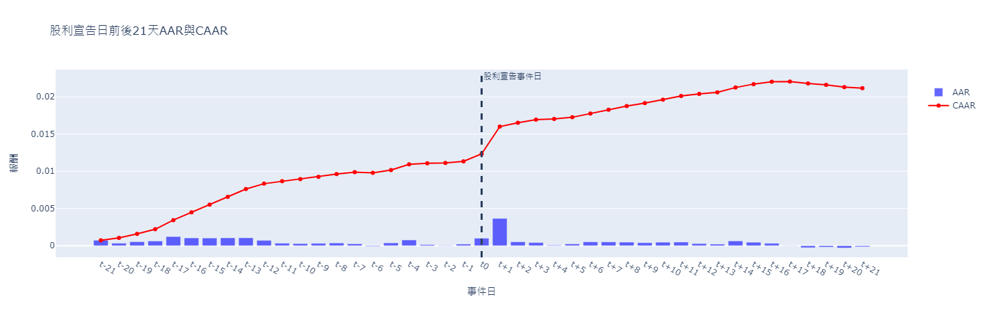 使用plotly.express進行視覺化呈現,從下圖可以看出,股利宣告日(t0)前21個交易日,CAAR就從t-21日的0.076%增加至t0日的1.228%,且均達到5%內顯著水平,顯示說市場在董事會開會前就有所反應,可能預期宣告股利後有進一步正向的股票反應故提前買入。
