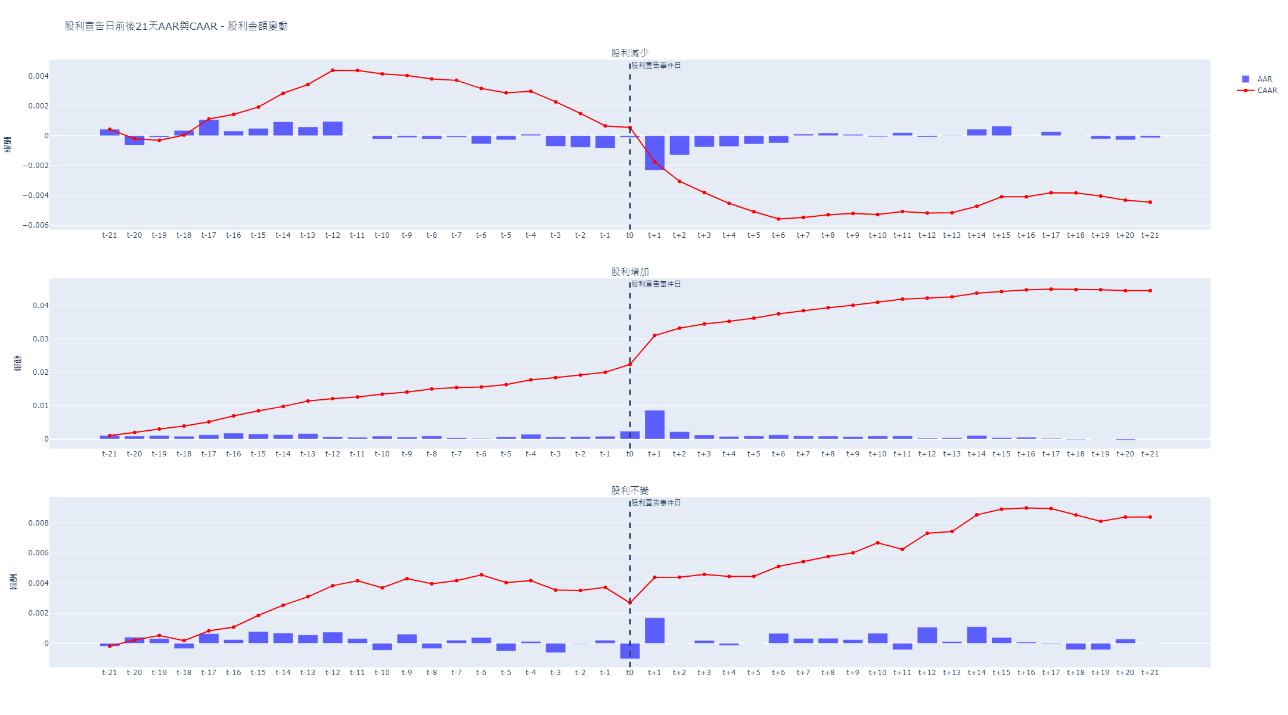 相對的,股利增加的樣本則從t-21日至t0日均有正向的AAR,使其CAAR在宣告日前就達到5%顯著水平的2.237%,並在隨後的t+1日中大幅拉高,AAR達到0.867%,CAAR攀升至3.104%,之後的t+2日至t+21日仍持續上升,最終達到5%顯著的4.448%。顯示市場已提前預估出公司營運良好,有充足現金流來維持既有股利,甚至可望進一步提高股利,因此反應至股票上帶動股價接連上升,最終使CAAR在宣告日後一個月內都持續緩慢增長。