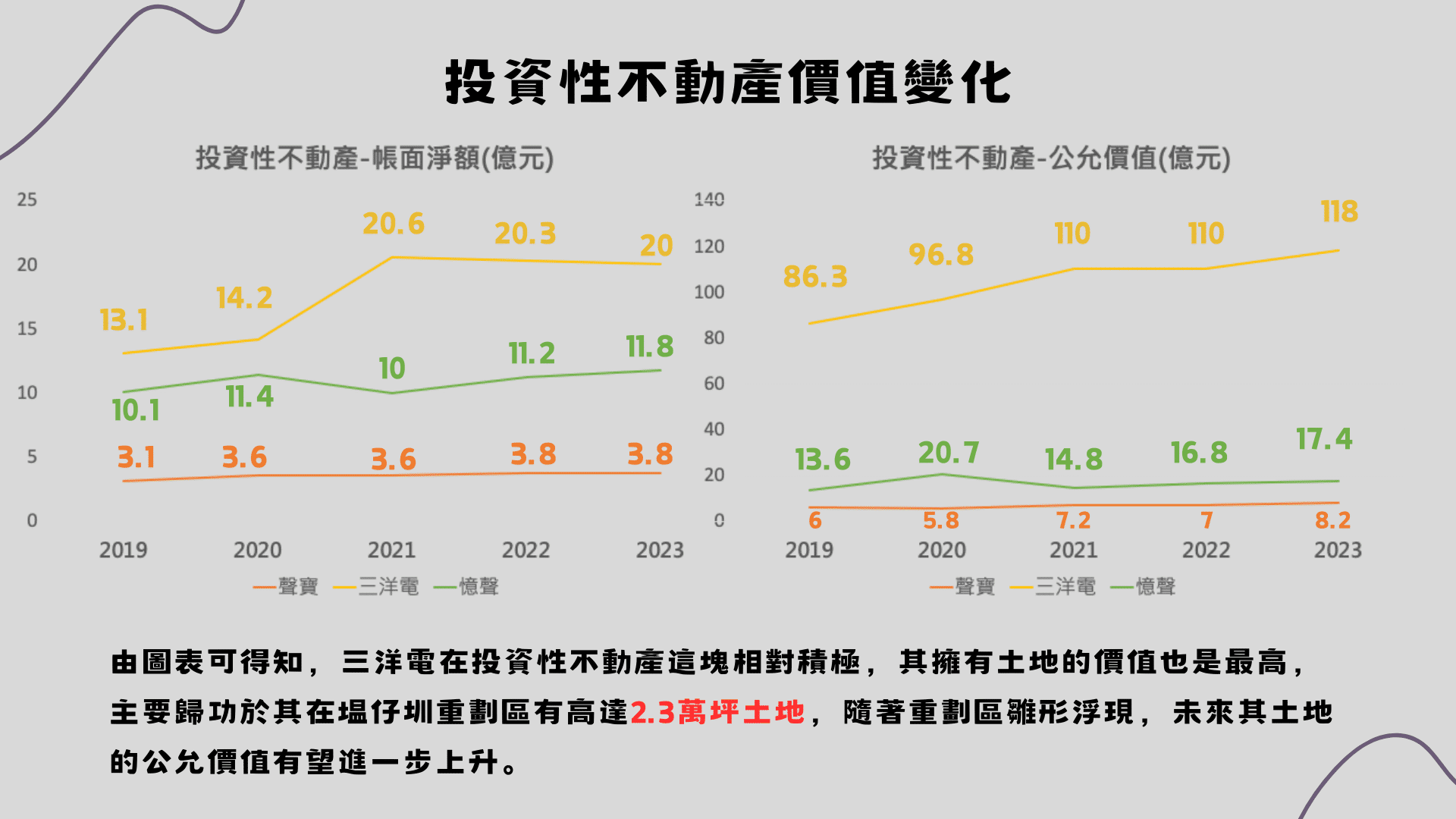 三洋電的泰山工廠位於新北市新莊區,佔地2.3萬坪,總樓地板面積7.7萬坪,2014年就將地目變更為住商綜合區。然據2023/06法說會,仍與新北市政府進行研商作業,並無實質進展。另南區倉庫位於高雄市本洲工業區,其中B區7,000坪2019年即打算出租,然迄今尚未出租。資產活化延宕多年,無新進度。