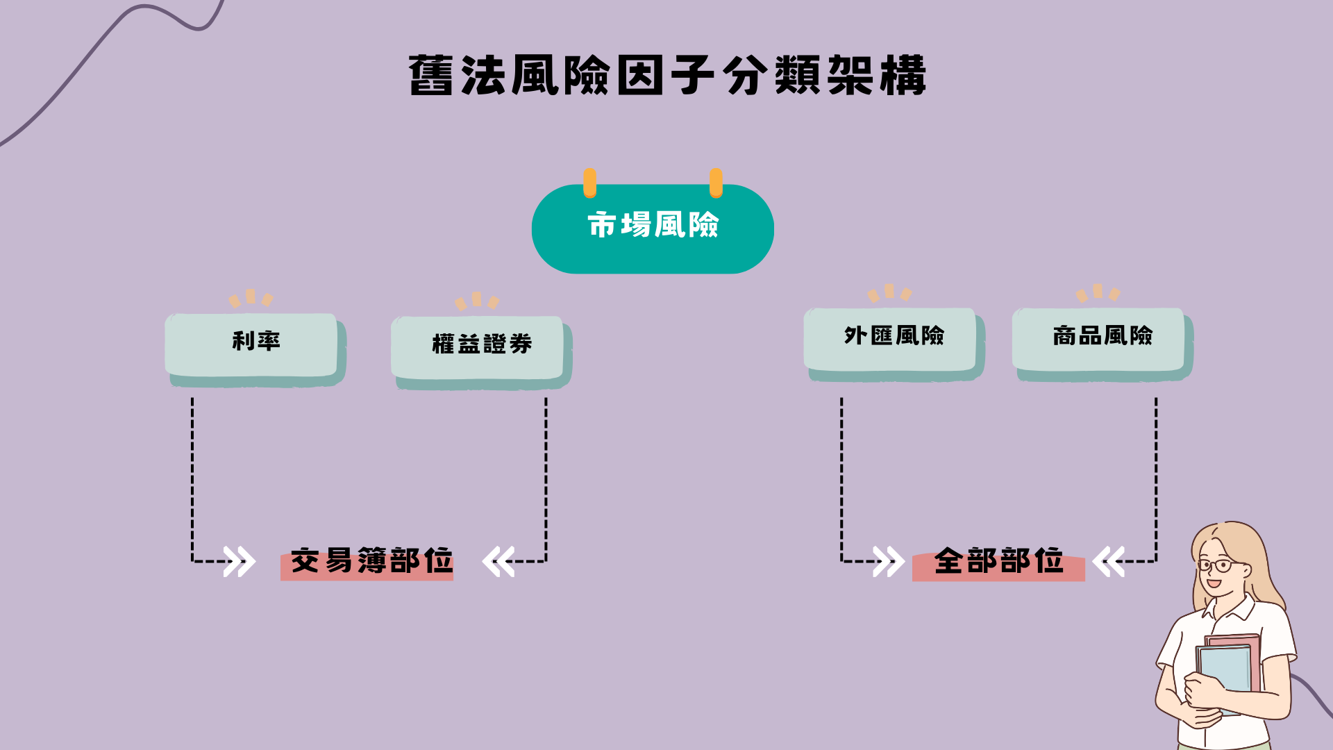 接著本文分别依序解析:舊法利率風險對應新法一般利率風險、信用價差風險;舊法外匯風險對應新法外匯風險;舊法權益風險對應新法權益風險;舊法商品風險對應新法商品風險。