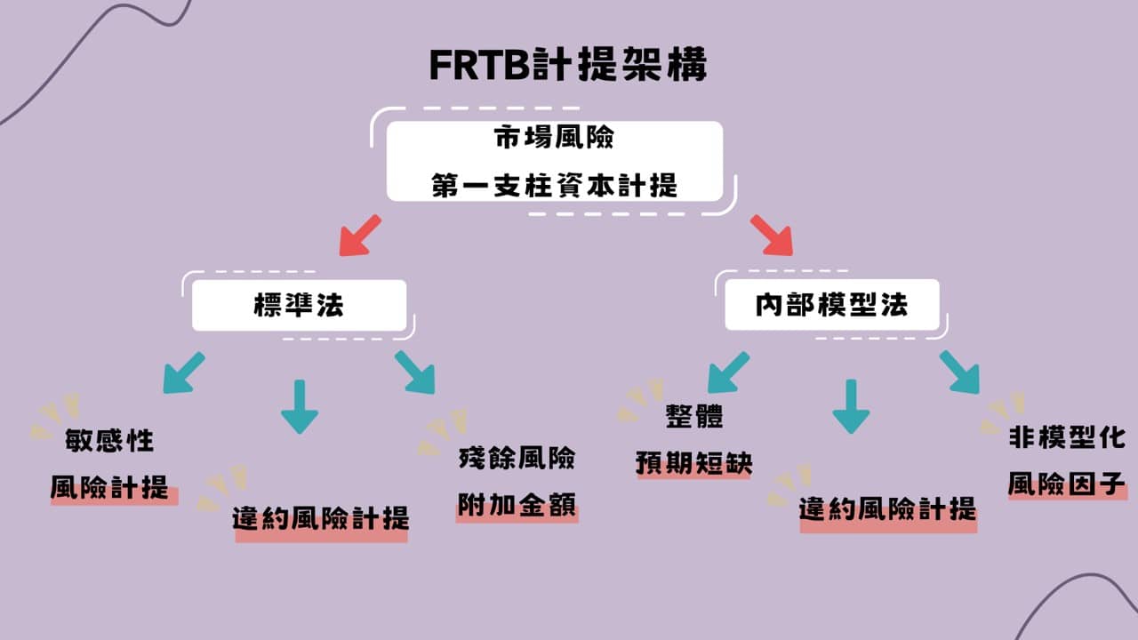 本文主軸將以標準法計提架構為主。 FRTB標準法規範拆分為三個計提架構:敏感性風險計提、違約風險計提、殘餘風險計提。其中敏感性風險計提架構可視為FRTB新標準法的計算主軸,且其與現行標準法之市場風險計提架構亦較為相似,皆為先針對資產做風險分類後,再進行後續的風險性加權計算。