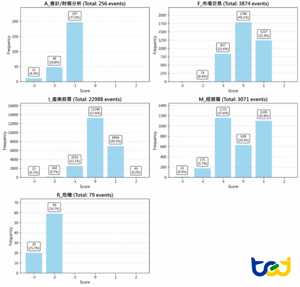 • I_產業前景事件數量最多(22,988 筆),主要集中於 0 分(57.6%)與 +1 分(30.3%),顯示此類資訊多為中性或正向。