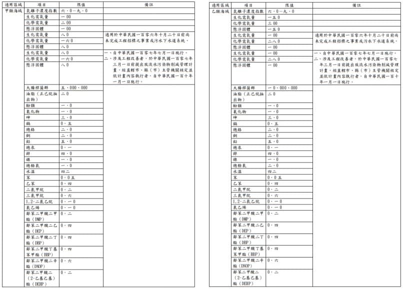 圖二、海洋放流管線放流水標準。資料來源:全國法規資料庫