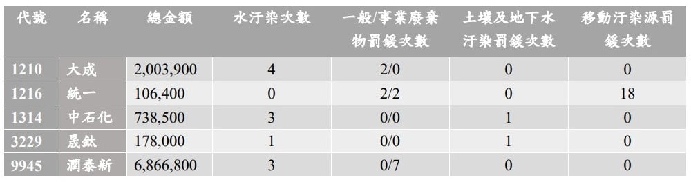 TEJ 之 TESG 永續資料集紀錄了水汙染、飲用水汙染、海洋汙染等多項裁罰項目、總金額及次數,可以有效分辨各年度違反個汙染指標之企業及該年度裁罰次數,以下將列舉部分去年(2022年)受汙染源裁處之企業。