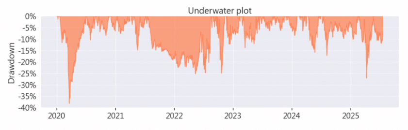 最大回撤(MDD)反映了投資過程中可能面臨的最極端帳面損失。 本策略的最大回撤(MDD)為 -38.219%,顯示即使具備穩定選股邏輯,在系統性風險發生時仍可能承受顯著波動。這也提醒量化投資者,在追求高報酬的同時,必須同步思考部位集中度與風險曝險管理。透過數據分析,投資者可理解如何利用 TEJ 資料庫中的風險因子,進一步優化進出場時機,以緩解回撤帶來的心理壓力。