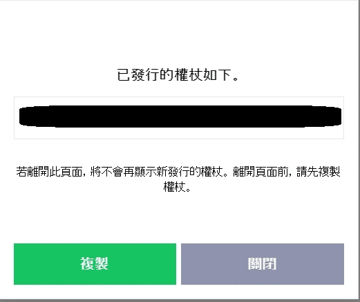 確認好之後,按下發行,就可以拿到我們的權杖Token(類似API KEY),如圖所示: