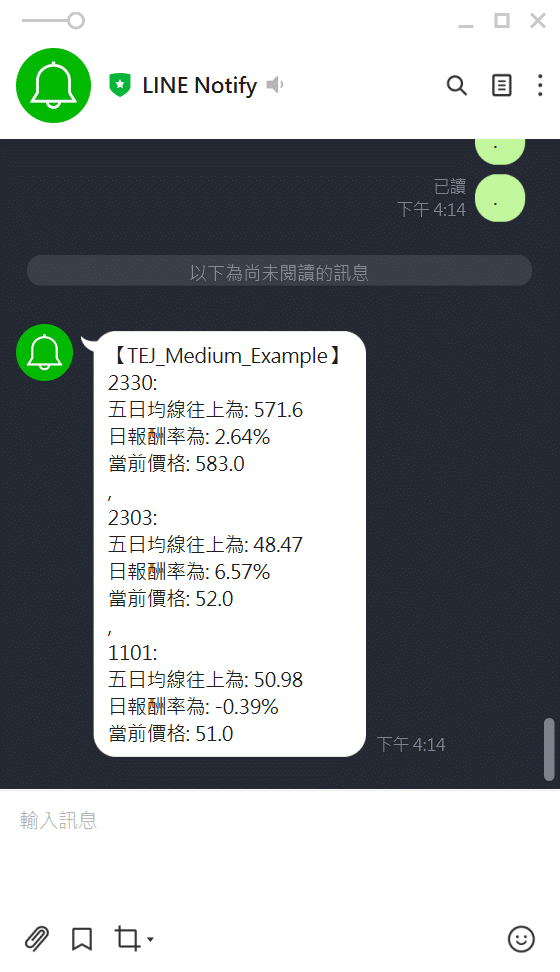 今天的內容主要是延伸自透過TEJAPI自動更新資料庫,再搭配Line Notify之下,我們可以直接將每日想要知道的資料自動地傳到我們的手機當中。小編今天只用均線、日報酬進行示範,使用者也可以根據自己的需要,像是技術指標數值、均線突破亦或是只想每天知道最新收盤價等,都可以透過這樣的方式進行推播,省下我們一個代號一個代號輸入的時間!!