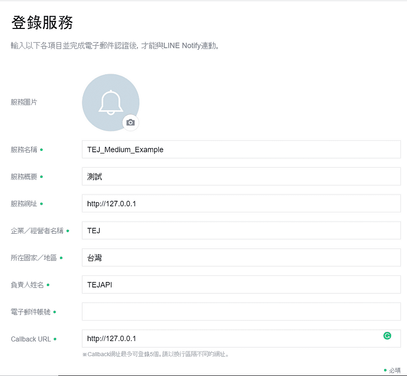 申請主要透過Line Notify官方網站,登入後可以看到一個按鈕叫做登錄服務,點進之後會看到以下欄位並填寫好之後會看到類似以下圖片,之中要注意的事是,因為Python都是在本機上面跑的,所以服務網址以及Callback URL皆為http://127.0.0.1,剩餘欄位都是自己的資料噢。