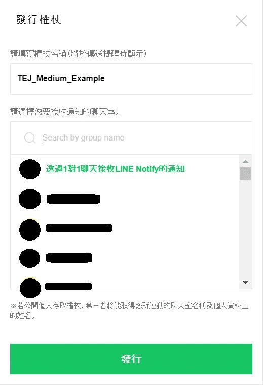 這邊網頁會詢問使用者要接收通知的聊天室,要注意的地方是,除了自身之外,如果要傳播資訊給多人,需要透過群組的方式才行!