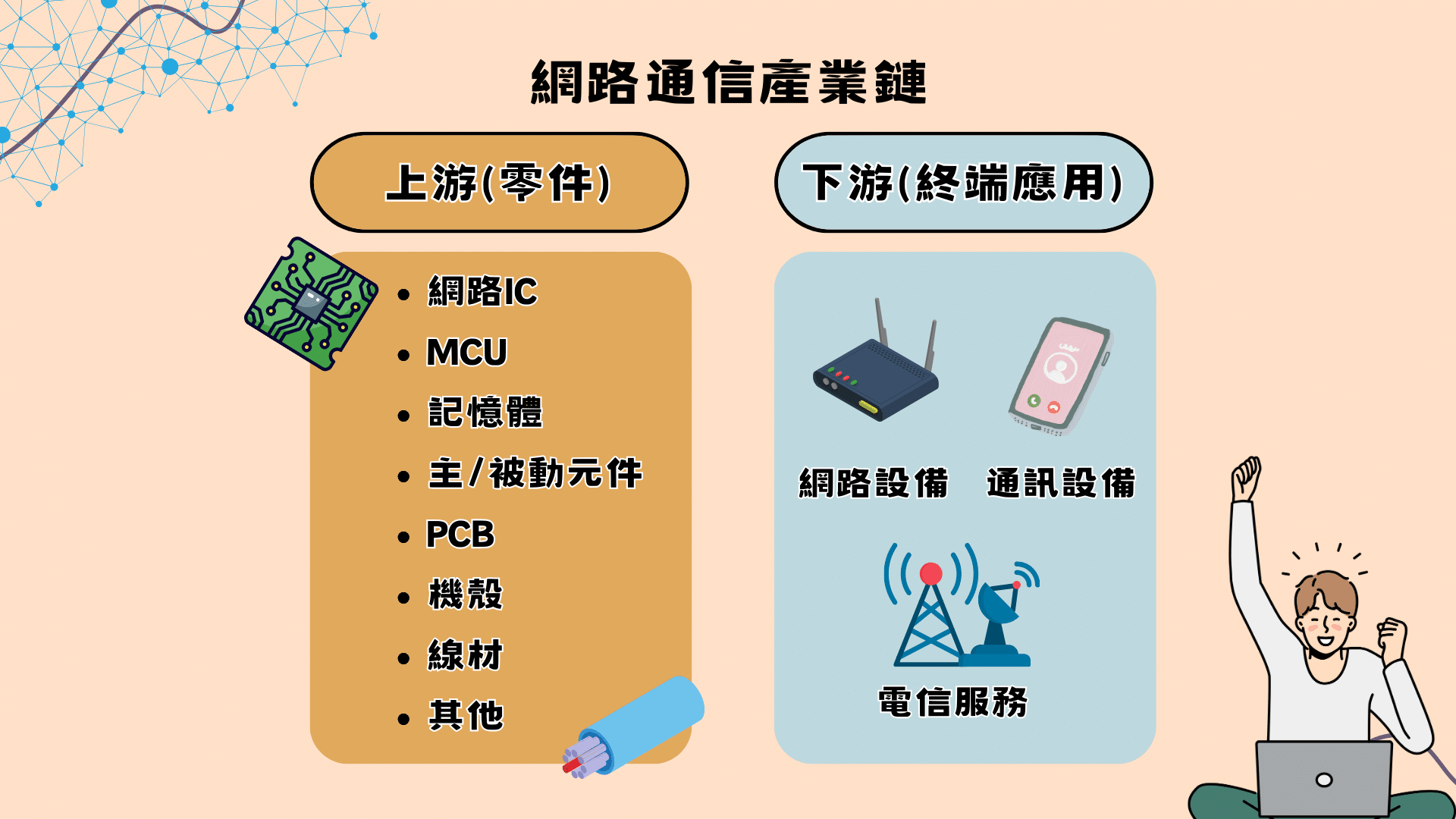 根據產業價值鏈資訊平台的描述,網通產業是一群開發利用有線或無線傳輸以接受符號、信號、文字、影像、聲音與其他訊息之廠商,產業鏈上游為組成各類通訊終端之零組件供應商,下游則為各類終端應用產品與服務之供應商。