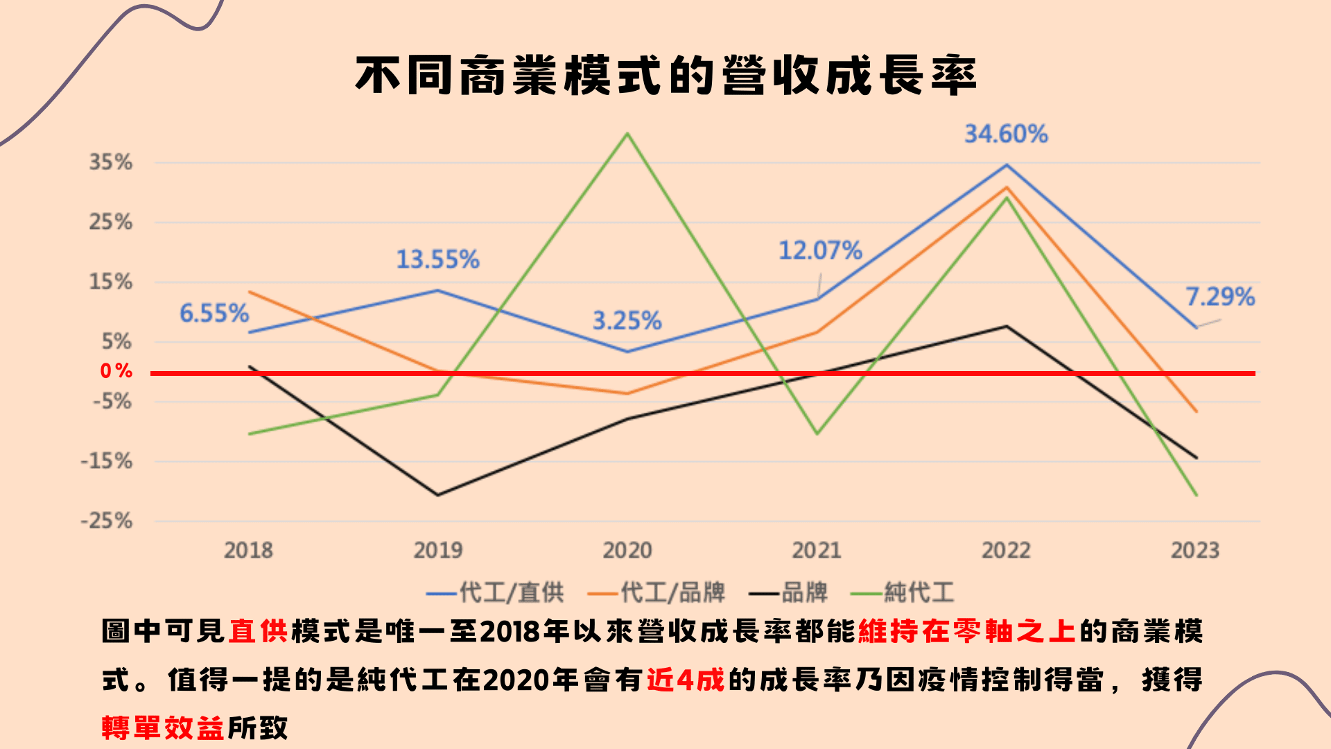 此外,與下游電信營運商建立直接供貨關係,較不易受品牌廠訂單需求牽制及庫存政策的干擾。下圖是各種不同型態代工的營收成長率,在2018年至2023年間,僅「代工/直供」的廠商沒有發生營收衰退情況,可以推斷抵禦短期內的庫存調節的能力明顯較佳。