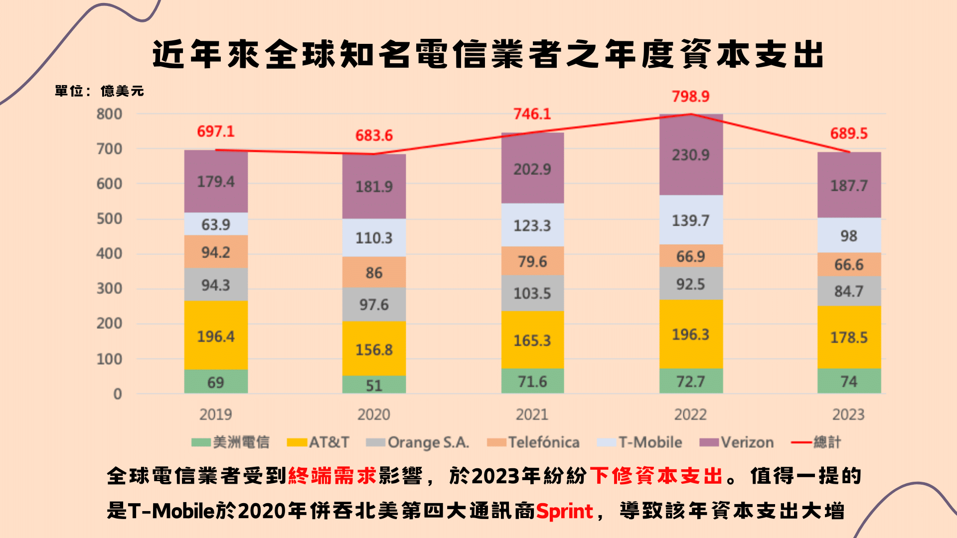 在網通產業中,與消費者最緊密的莫過於電信業者,其年度資本支出透露出對未來景氣之看法。以全球著名電信業者AT&T、T-Mobile、威訊通訊等六家業者之資本支出來看,2020年受到COVID-19疫情蔓延,導致多數電信業者網路建設停擺,然而2021、2022年兩年隨著疫情後復工及各國基礎建設法案陸續施行,推升資本支出總額至799億美元之新高點;但在終端需求不振下,2023年幾乎所有電信業者下修支出金額,總額回歸至690億美元。