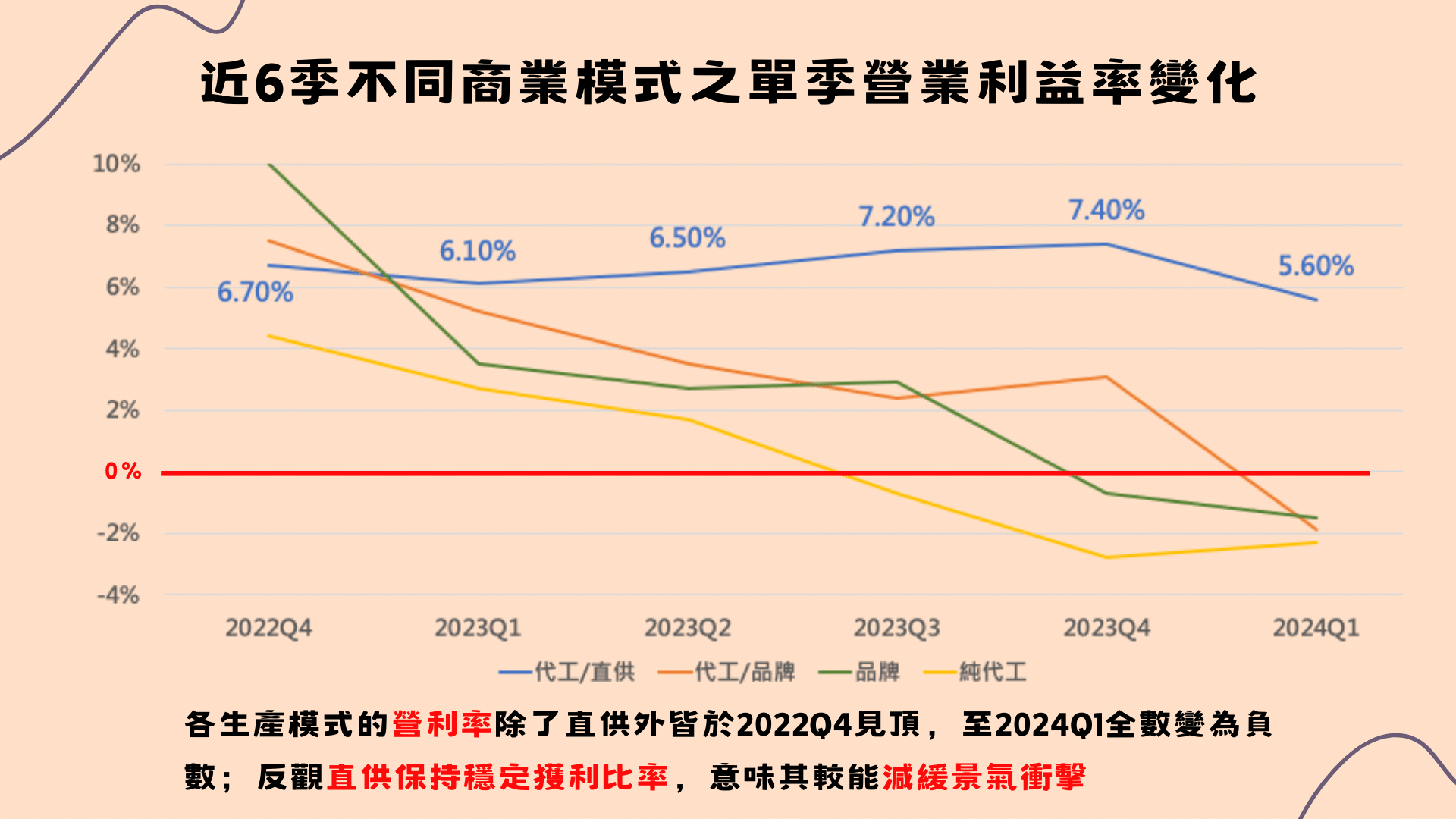 台廠不管是自有品牌或代工的發展皆與產業走勢息息相關,但值得注意的是,直供廠商的營業利率在2024年Q1的表現明顯強於其他商業模式,是唯一為正的表現。此乃直供廠商直接替大型企業(網路巨擘)、政府及電信商進行代工,少了品牌廠或轉包商的中間分潤;同時長期與大型客戶的合作,因此合約與供貨排成較穩定,能夠減少受到下游客戶需求變動的影響。