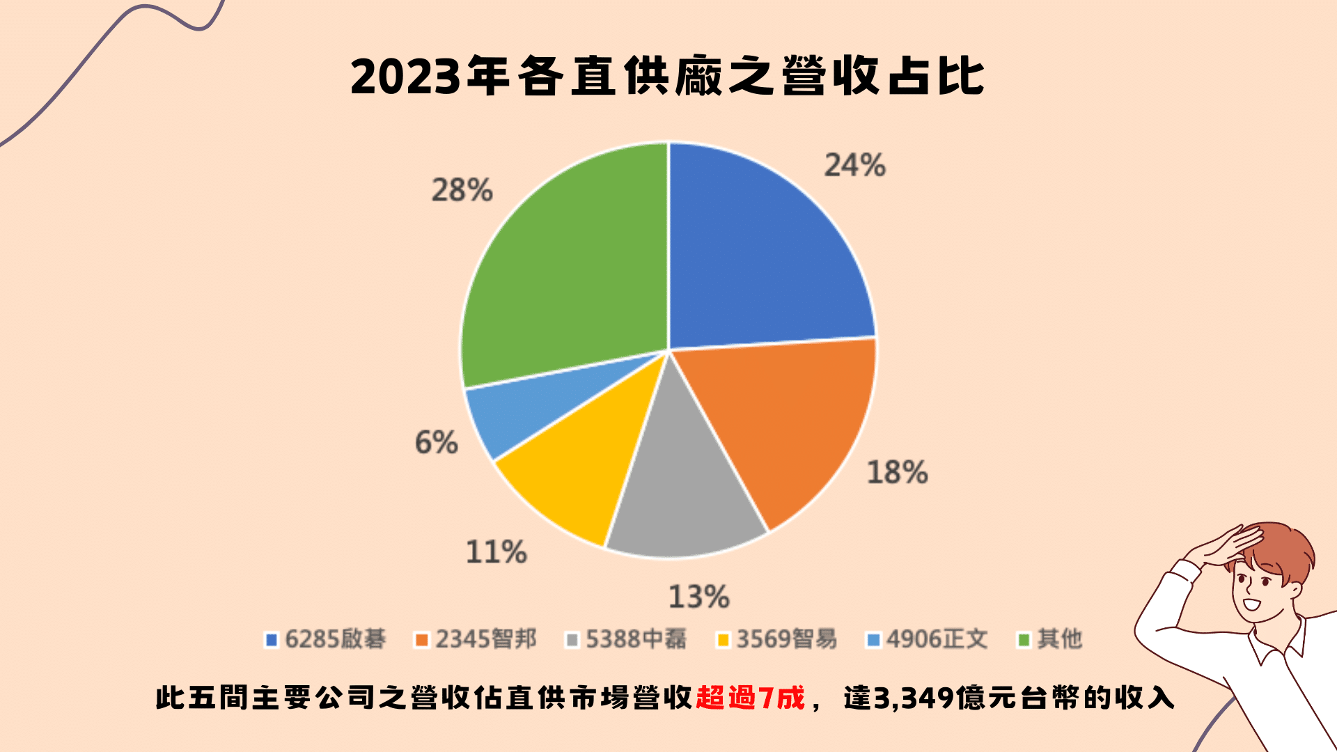 直供廠商主要有啟碁、智邦、中磊、智易及正文,因生產規模大,創造了規模經濟及可觀營收。以2023年為例,規模最小的正文年營收達新台幣261億元,最大的啟碁達1,108億元,五家廠商合計占整體市場的七成,顯示其在台灣網通設備業中舉足輕重的地位。他們擁有足夠的資源和產能,能與電信營運商、大型企業及政府機關直接洽談供應。想當然,這些廠商也是報章媒體談論到網通設備廠時,主要會關注的對象。