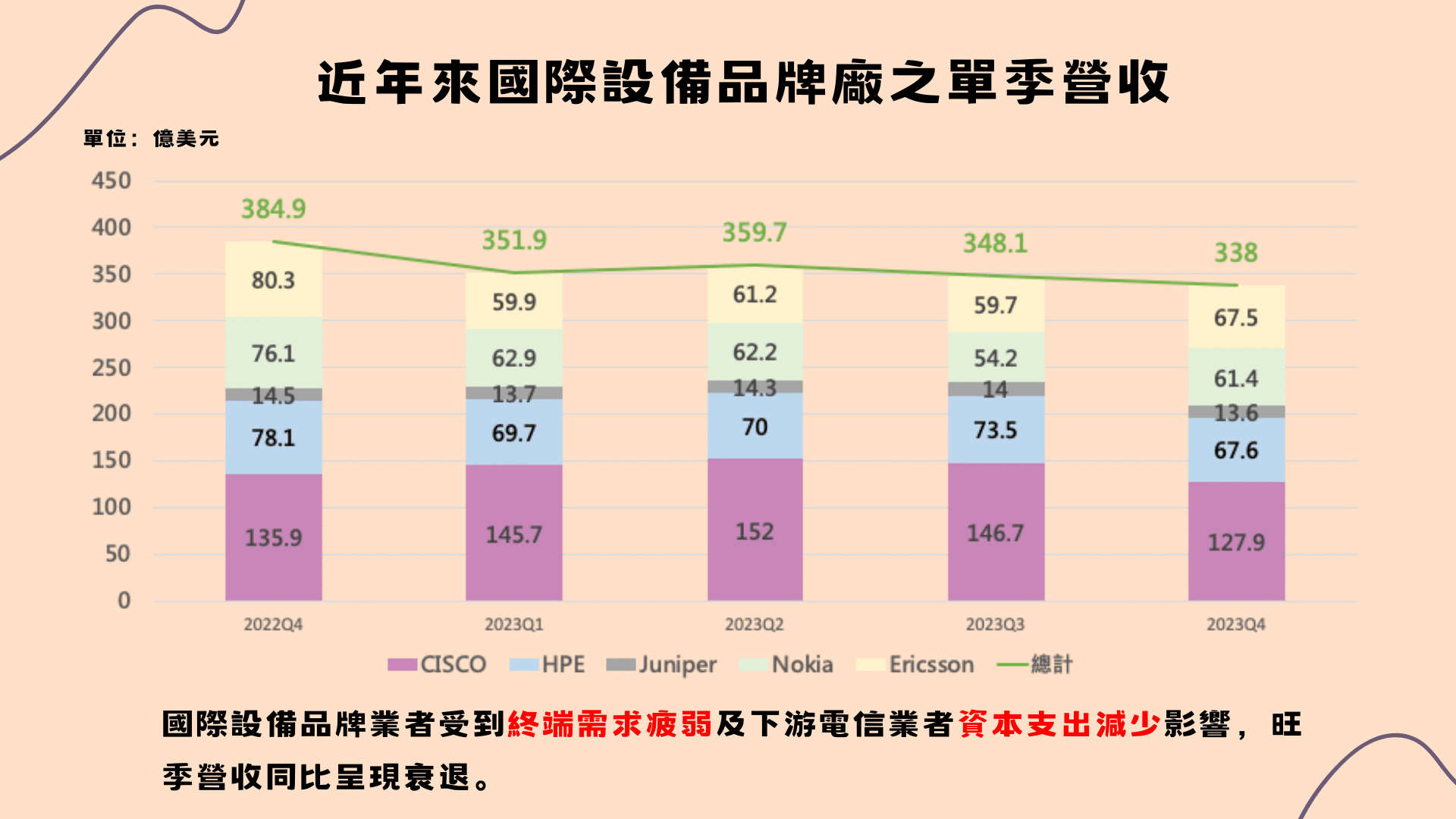 國際設備品牌廠以CISCO、HPE、Juniper、NoKia及Ericsson五家廠商為首,從其整體季度營收也能看出與電信業者相同的情況。其在2022年Q4的傳統營收旺季寫下近年新高,但在2023年Q4卻出現大幅衰退,顯現終端需求疲弱及下游電信業者資本支出減少,反應在各大廠營收。