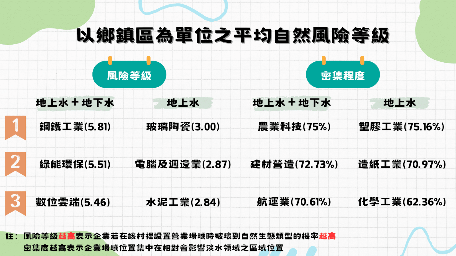 倘若只能取得企業場域位置的鄉鎮區資訊為單位,可統整各產業在淡水領域的自然風險,並依據風險等級與密集程度,排序出前三高的產業,結果如下圖。