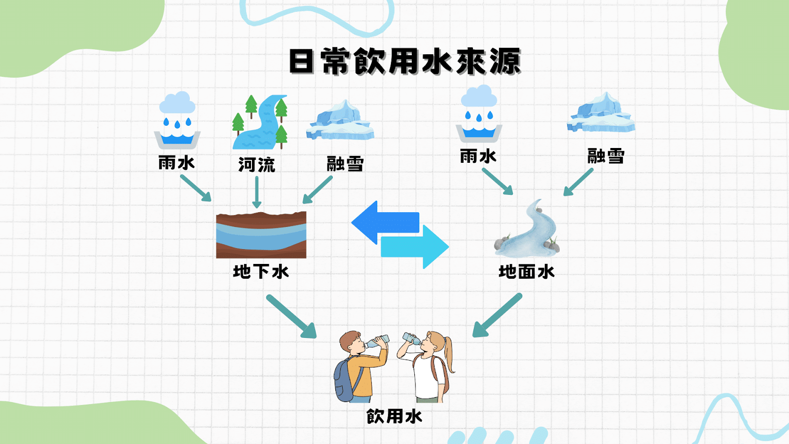 日常飲用水主要源自地下水體與地面水體兩種。所謂地下水體係指埋藏在含水層的泉水,而地面水體係指河川、湖泊、雨水、冰川、融冰等,即水質皆在地面汲取,暴露於空氣中。地面水會透過降雨、融雪及地下水進行補充,而地下水會降雨、融雪及河流滲透等方式進行。