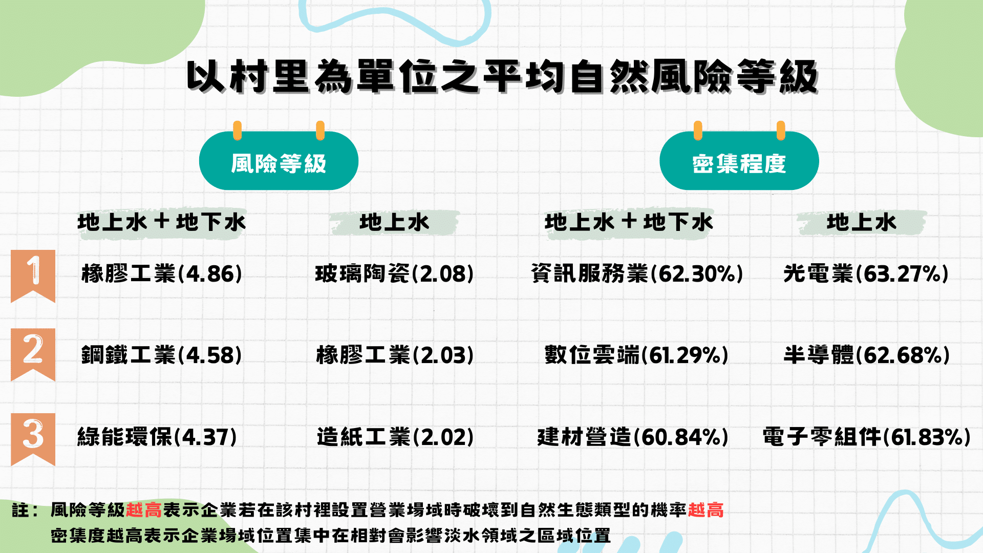 | 產業名稱 | 平均自然風險等級 | % | 產業名稱 | 平均自然風險等級 | % |