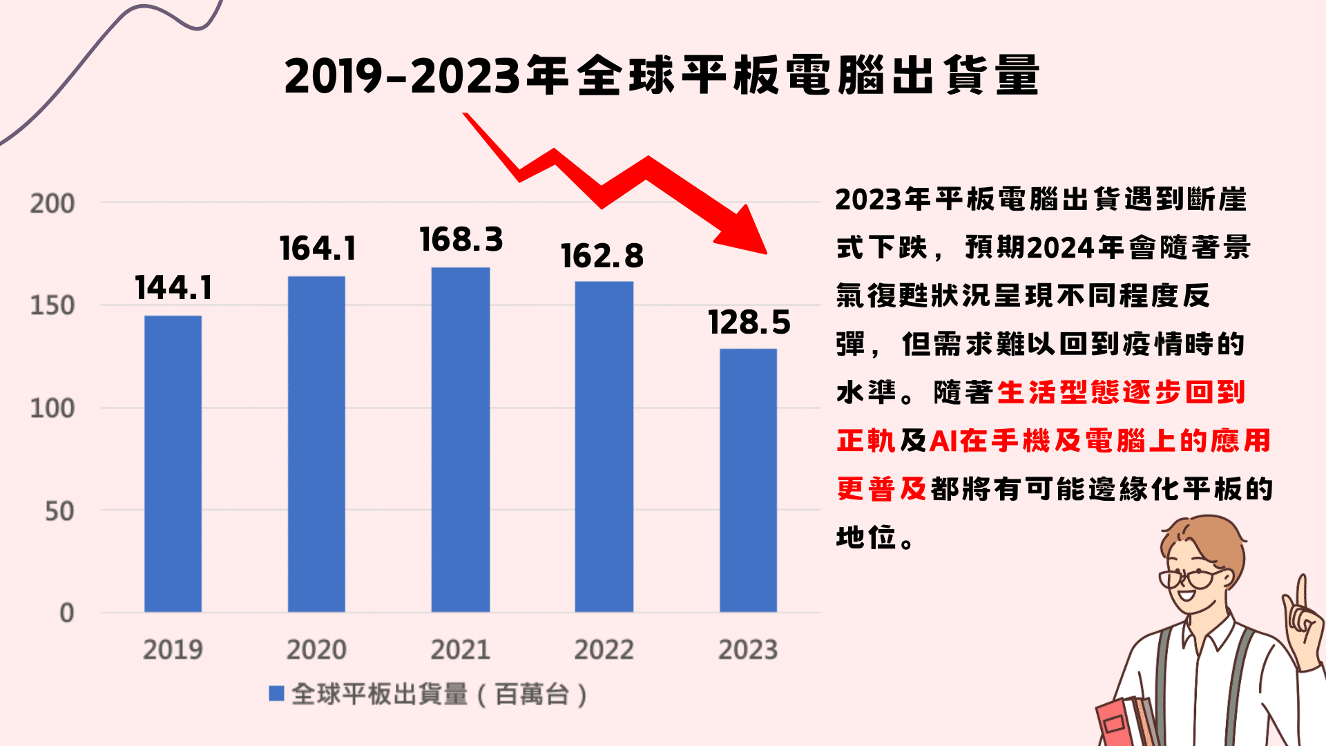 至於平板的部分,相較於手機及電腦更沒有必需性,因此當景氣不好又通脹嚴重下花費於平板的預算會最先被刪減。在出貨量的數據上能證實這個看法,根據IDC的資料,2023整年度的平板出貨量相較2022年減少20%,是自2011年以來的年度最低水平。而平板界的龍頭蘋果自然無法獨善其身,出貨量季減30%、年減20%。在2023年底又加入了新競爭對手——中國的藍思科技,作為蘋果的供應鏈打手來制衡GIS-KY及TPK-KY。由於平板的觸控面板皆為兩家最主要的業務,因此為避免過度依賴單一產品各台廠也準備好變更產品組合來應對。