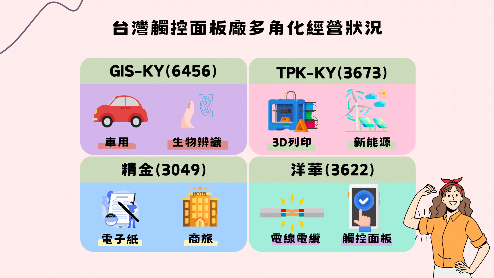 GIS-KY(6456)為台灣觸控面板龍頭廠商,除原本的觸控模組業務外將持續拓展車載及指紋辨識產品。車載產品主要有顯示器、中控台觸控螢幕、B柱人臉辨識等產品,目前部分品項將導入鴻海旗下電動車款,但鴻海尚未有電動車推出,效益仍待觀察。