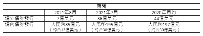 根據Moody’s中國房地產業專欄「中國房地產市場焦點:銷售增長放款將另開發商的流動性承壓」分析中國房企事業7月及8月債券發行量與2020年月均水準比較如下表所示,相較去年月平均有顯著下滑,可以得知外部籌資力度在相關限制政策出台後有相當大的衰退,無法順利籌資也直接導致在9月宣告無法償還債務公告。